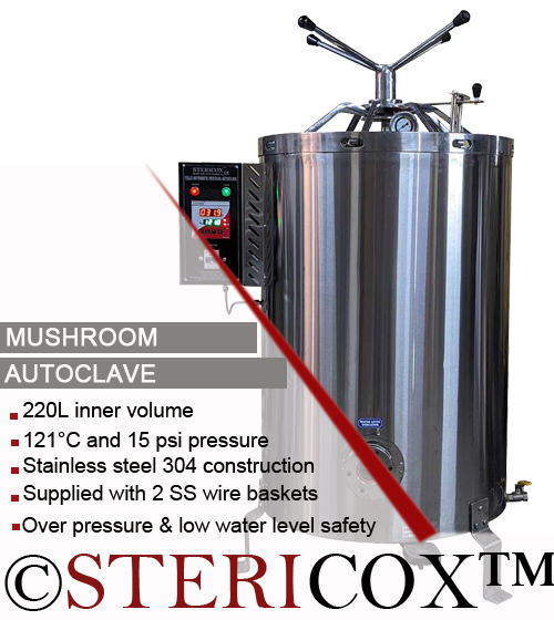We at STERICOX manufacture, supply and export mushroom autoclave. Our STXVAP220 (220 liters vertical autoclave) is the best-selling model around the world. This autoclave is fully made of 304 grade stainless steel for corrosion free performance. It is fitted with digital temperature controller with in-built timer and alarm. Operator can set both the temperature and timer; when the timer ends, loud beep sound alerts the operator. Steam is automatically released after sterilization. This unit comes with two heavy duty stainless steel wire baskets equipped with removable handles. Every mushroom autoclave is thoroughly tested on multiple parameters before dispatch to ensure excellent quality for our customers. We not only supply these autoclaves not only across India, we also export them worldwide - especially to the USA, UK, Germany, Africa, Philippines, Malaysia, Nepal, Bhutan and Norway and many other regions at direct factory price.